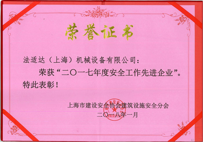 榮獲市“2017年度安全工作先進企業(yè)” 時 間:2018-01-18 22:10:43 瀏覽次數(shù):7213 法適達榮獲由上海市建設(shè)安全協(xié)會建筑設(shè)施安全分會頒發(fā)的“2017年度安全工作先進企業(yè)”。