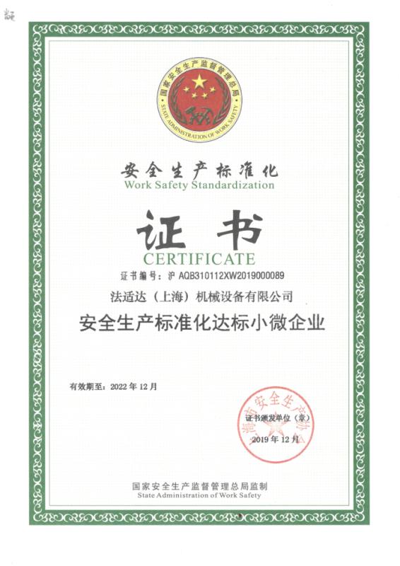 法適達(dá)公司安全標(biāo)準(zhǔn)化通過 時 間:2020-01-02 10:30:24 瀏覽次數(shù):4005 法適達(dá)通過安全標(biāo)準(zhǔn)化認(rèn)定,拿到上海市安全協(xié)會頒發(fā)的證書。